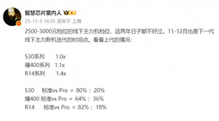 因此在新一代中端机大战之前,行业人士“智慧芯片案内人”给出了上一代的销量对比。他表示2500-3000元档位的线下主力机档位,这两年日子都不好过。11-12月也是下一代线下主力新机迭代的时间点,先来看看上一代的情况。这一次是以vivo S30系列为基数的,信息显示vivo S30系列的销量为1.0X,荣耀400系列的销量为1.1X,OPPO Reno14系列的销量为1.4X。遗憾的是没有看到华为nova系列、小米Civi每的数据。抛开华为、小米不讲,给出数据的这三个品牌OPPO的销量最好,但这三个品牌之间的差距并不大。